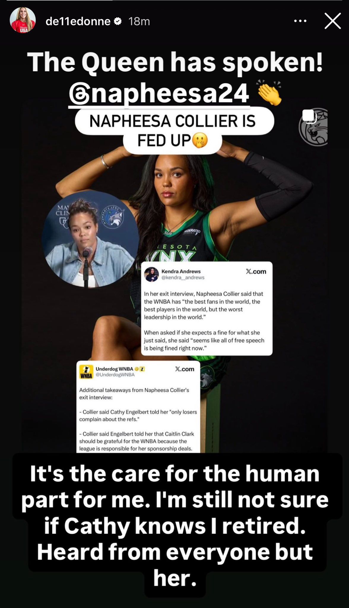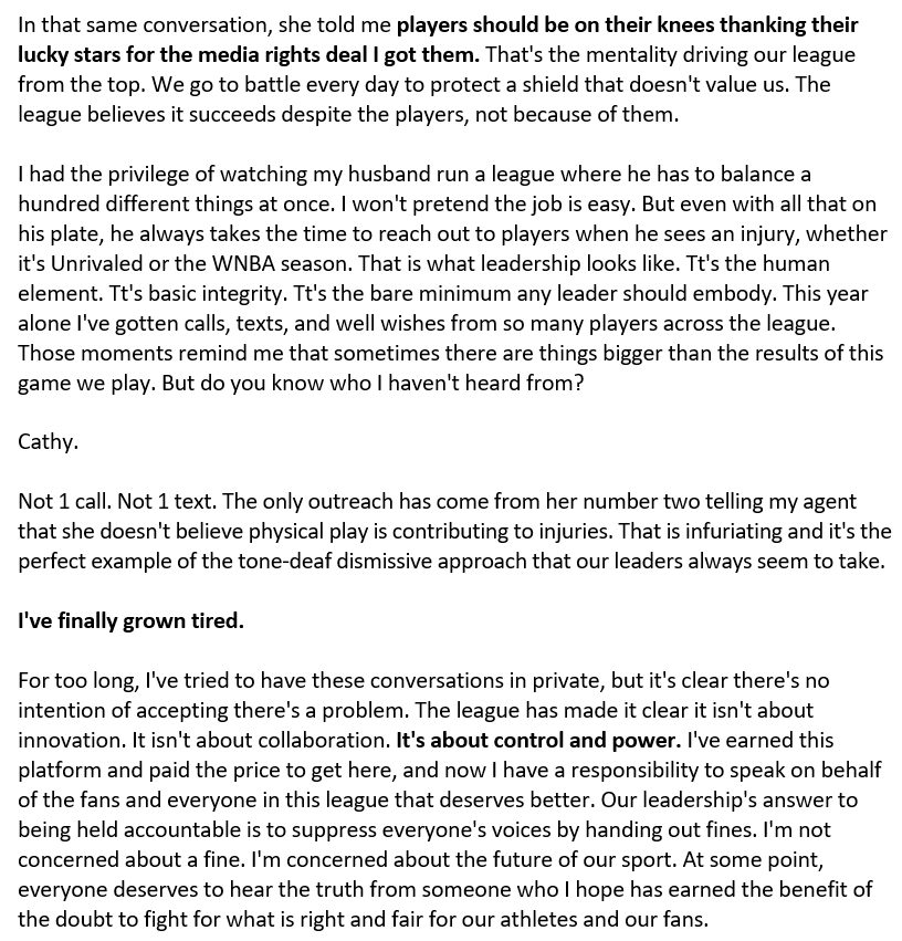 This morning, the Lynx were set to do their exit interviews as their season came to an end. Napheesa took this time to deliver a four-minute speech that absolutely eviscerated Cathy and the league. Honestly, this might be the boldest statement I’ve ever seen from a player—let alone a WNBA player.