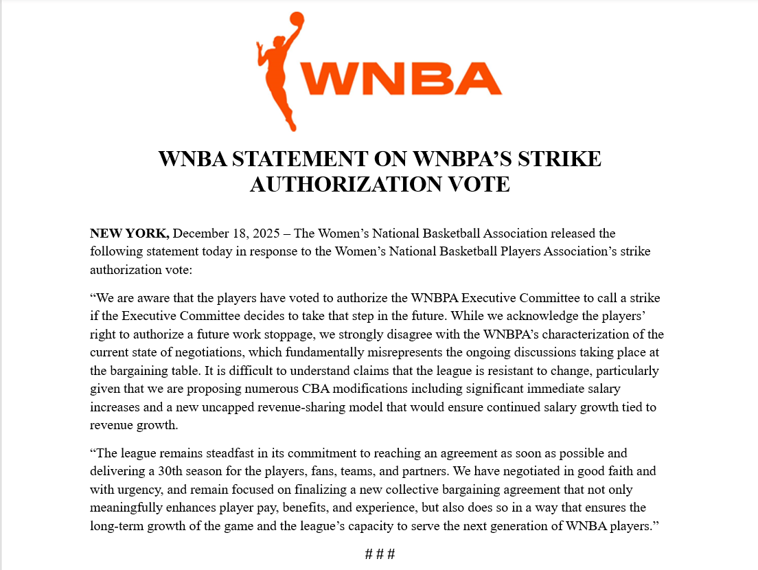 Time and again, the players’ thoughtful and reasonable approach has been met by the WNBA and its teams with a resistance to change and a recommitment to the draconian provisions that have unfairly restricted players for nearly three decades. The players’ vote is neither a call for an immediate strike nor an intention to pursue one. Rather, it is an emphatic affirmation of the players’ confidence in their leadership and their unwavering solidarity against ongoing efforts to divide, conquer, and undervalue them.